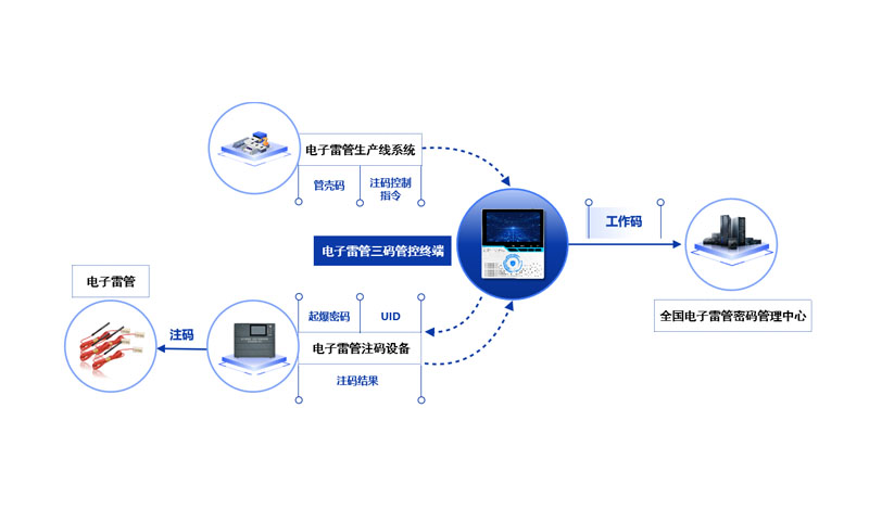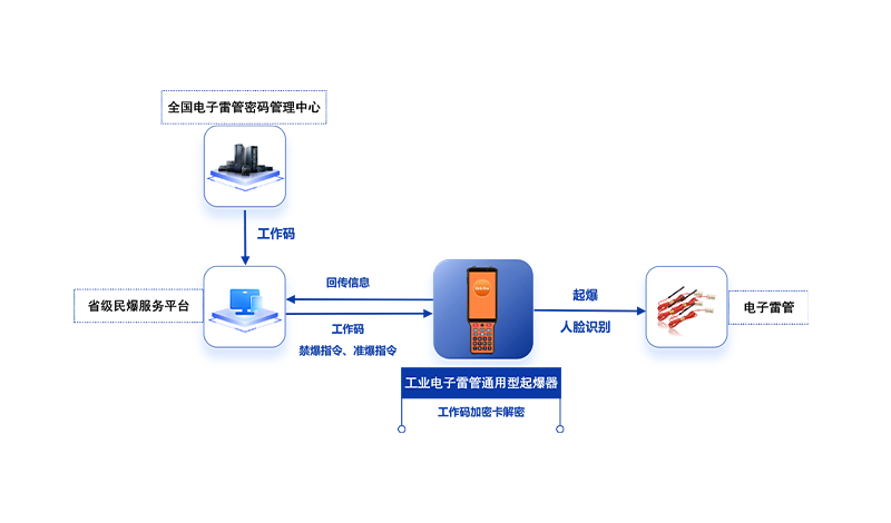 根据国家公安部、工信部共同颁布的《GA1531-2018工业电子雷管信息管理通则》,为建立电子雷管管控体系,进一步提升民爆物品治理的现代化水平,减少民爆物品非法流失,电子雷管各个环节需优化管控措施,确保通则有效落地施行。电子雷管全流程解决方案从生产、运输、领用发放、使用、安全监管等几个主要环节切入,通过设备与平台的多方联动,与民爆系统实现业务管理闭环。